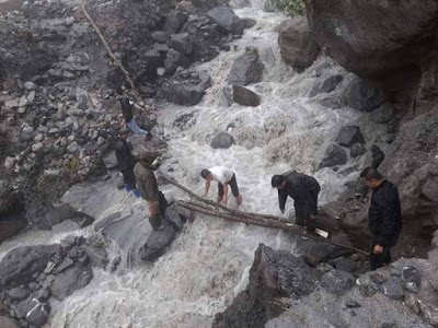 | उत्तरमा उर्लेको खहरेमा फड्के बनाएर तर्दै मन्त्री टीडब्ल्यू लेप्चा। |