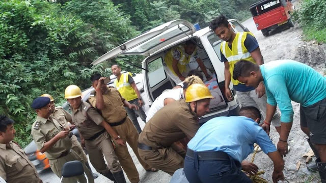 दुर्घटनास्थलमा उद्धार कार्यमा सक्रिय पुलिसकर्मी र हाइवे हिमालयन डिजास्टर म्यानेजमेन्टका सदस्यहरू।